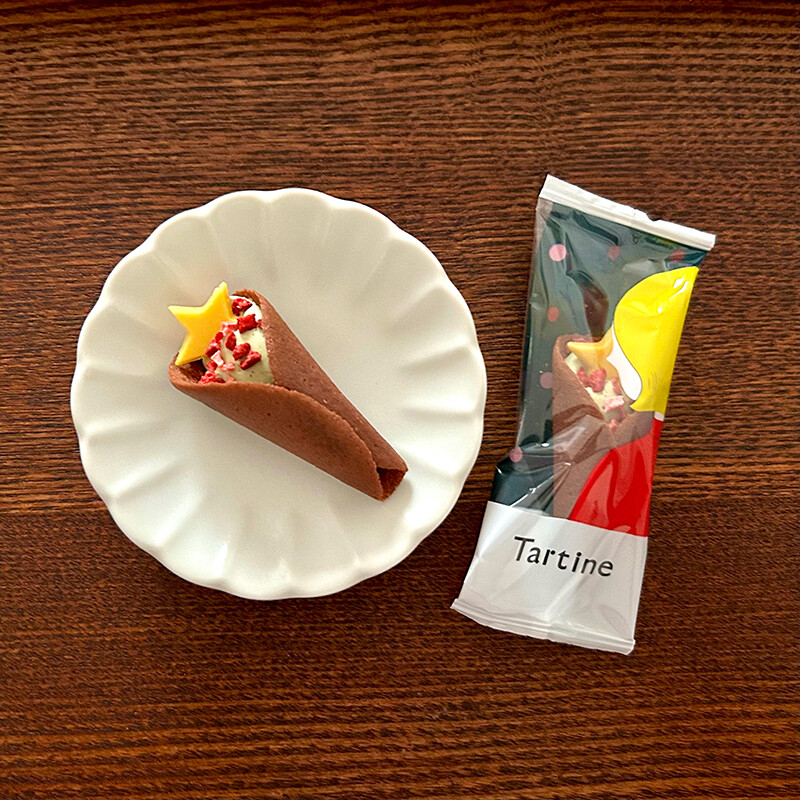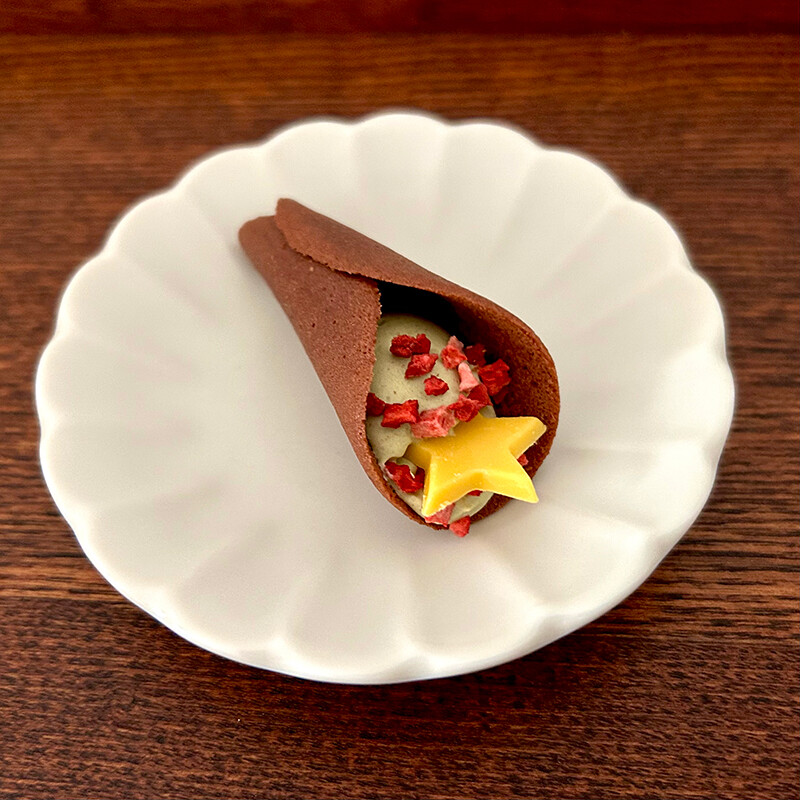 ピスタチオクリームをココアベースのラングドシャで包んで、ドライストロベリー、星型のチョコレートがトッピングされているようです。